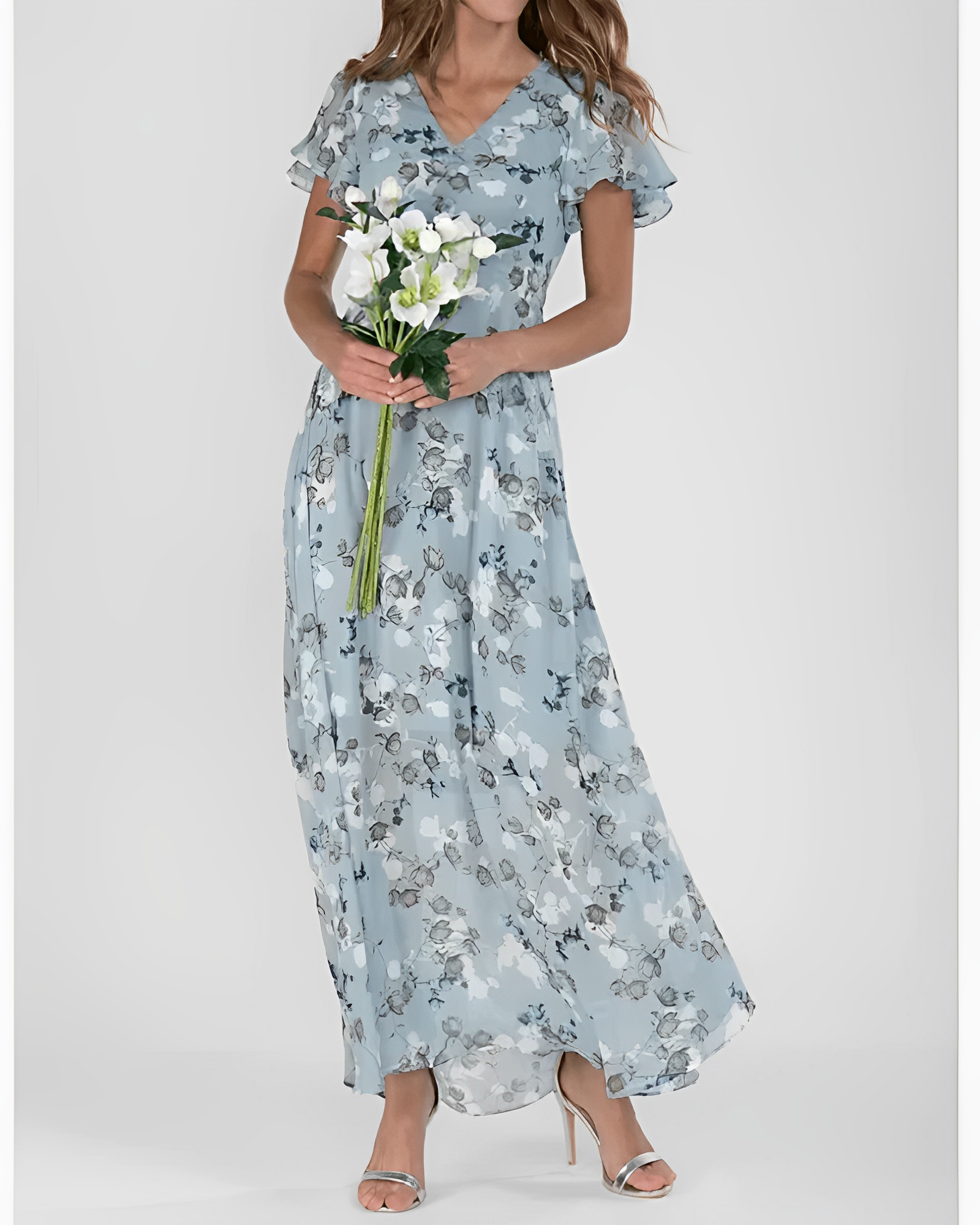 Dieses elegante Damen Sommerkleid mit Blumen für Hochzeitsgäste vereint stilvolle Eleganz mit einem romantischen Blumendruck. Die lange Maxi-Länge und der vorteilhafte Schnitt gestalten eine elegante Silhouette, während das luftige Design ideal für warme Tage ist. Perfekt für Hochzeiten, schicke Sommerveranstaltungen oder besondere Anlässe.
